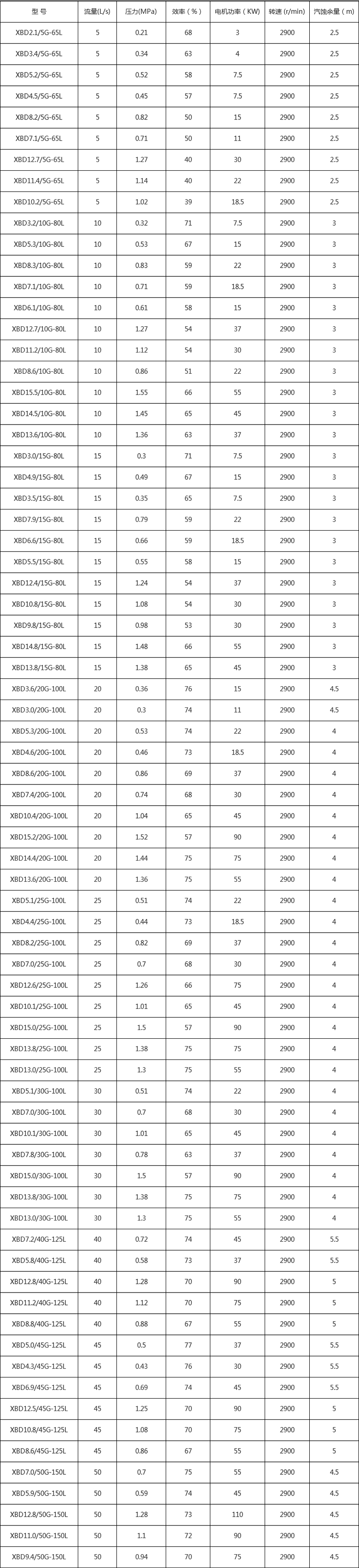 XBD消防泵主要性能參數(shù)表